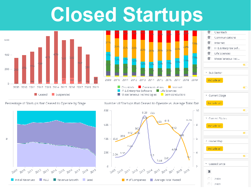 The IVC-Online Database holds information on thousands of startups established in Israel. The Startup Analytics set of dashboards is an interactive tool providing insights on things like the rate opening of new startup companies, industry growth and industry status.