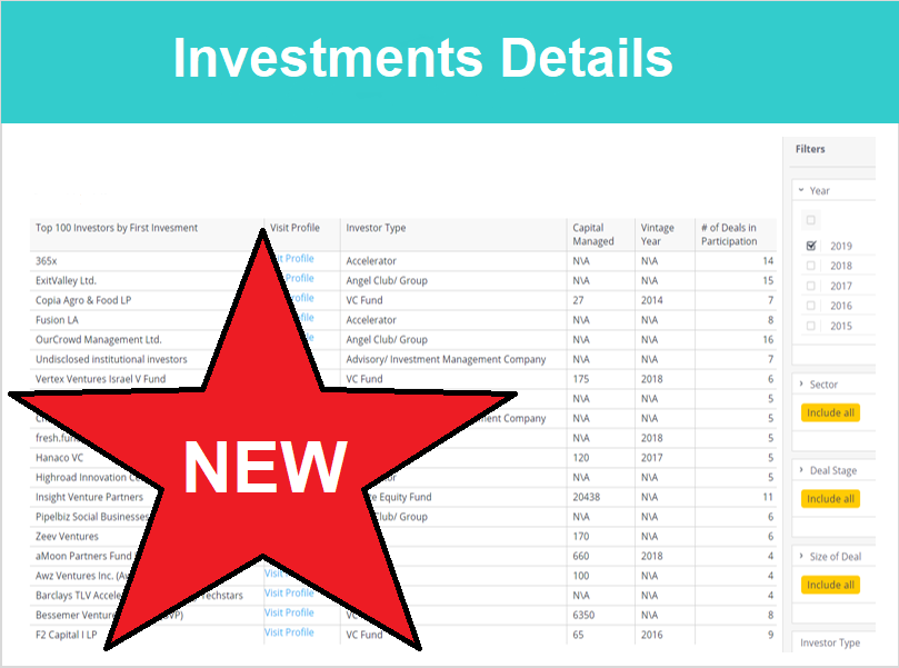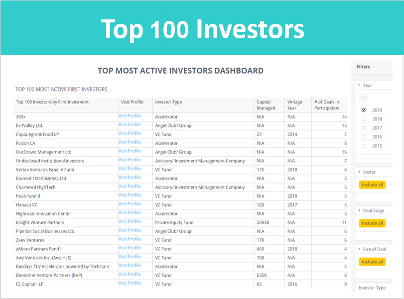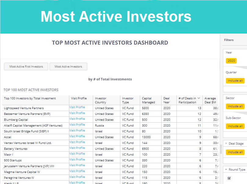 Get to know the most active funds, and more! filter investors by several parameters such as type, number of first investment, sector, Israeli/non-Israeli, amount, and more